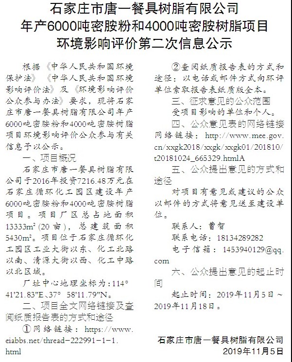 石家庄市唐一餐具树脂有限公司年产6000吨密胺粉和4000吨密胺树脂项目环境影响评价第二次信息公示