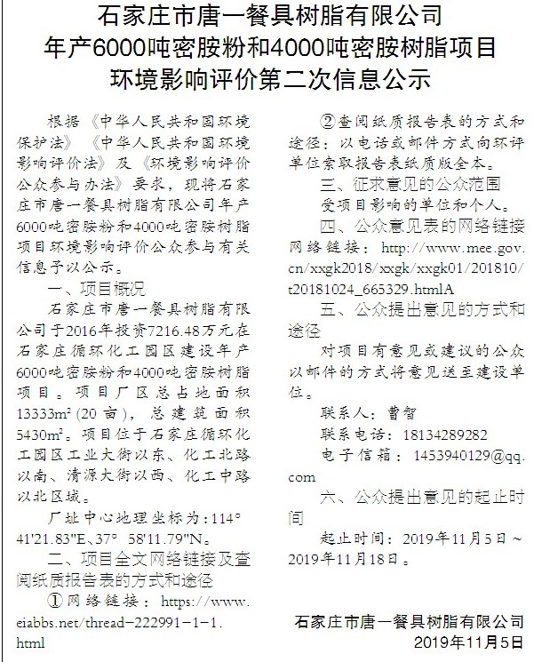 石家庄市唐一餐具树脂有限公司年产6000吨密胺粉和4000吨密胺树脂项目环境影响评价第二次信息公示