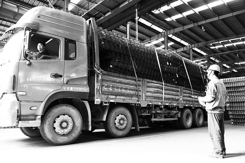 本报讯 (记者胡智慧通讯员王美英摄影报道)10月23日,多辆载重运输车在位于安徽省马鞍山经济技术开发区的马钢比亚西公司装载成品焊网,运往多处高铁建设重点项目工地。