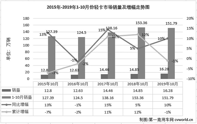 5月份,连续增长的轻卡市场因521事件而“受阻”,接下来的6、7月份又遭遇了连降;轻卡市场在8月份实现转正后9、10月份再连增两月,但累计销量尚处于下降区间。轻卡市场在“金九银十”传统旺季分别收获2%和10%的增长,并且9、10月份的市场表现在近5年里看均是最佳。在2019年仅余2个月的情况下,轻卡市场能否逆转目前1%的累计下降,最终表现能否优于2018年,仍是悬念十足。