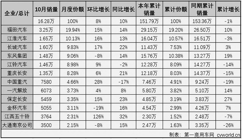 10月份,轻卡市场销量破万的企业有6家,分别是福田、江淮、长城、东风、江铃和重庆长安,月销万辆俱乐部成员和8、9月份一致。月销量居前两位的企业仍是轻卡市场仅有的两家月度份额超10%的企业,但10月份的第二换成了江淮。10月份,福田和江淮两家企业分食了轻卡市场超3成的份额。10月份,排名前十的企业合计份额为81.06%,还有近2成的市场分给了销量前十以外的企业,这种竞争强度,只有轻卡市场里才能感受得到。“孤独领跑”的福田10月份超3万辆的销量让其他追赶者望尘莫及。