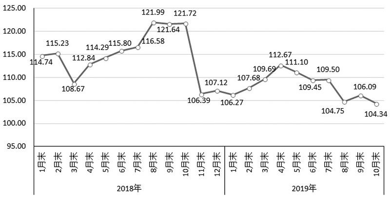 10月末,钢铁协会中国钢材价格指数(CSPI)为104.34点,环比下降1.75点,降幅为1.65%;同比下降17.38点,降幅为14.28%。