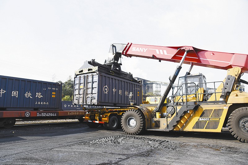 图为11月28日,物流公司员工在马钢炼铁总厂南区卸料区域倒运平板列车上的集装箱。(下转A7版)