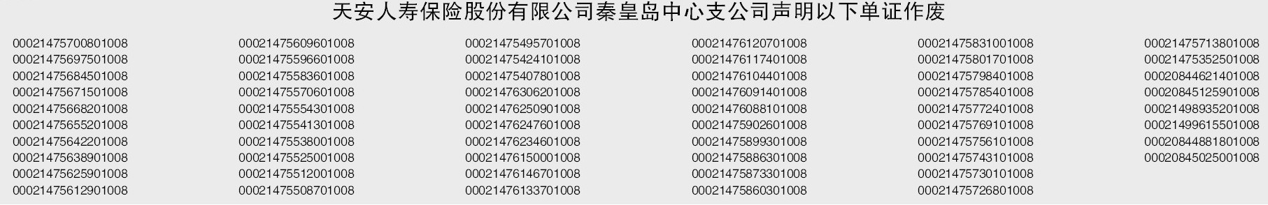 天安人寿保险股份有限公司秦皇岛中心支公司声明以下单证作废