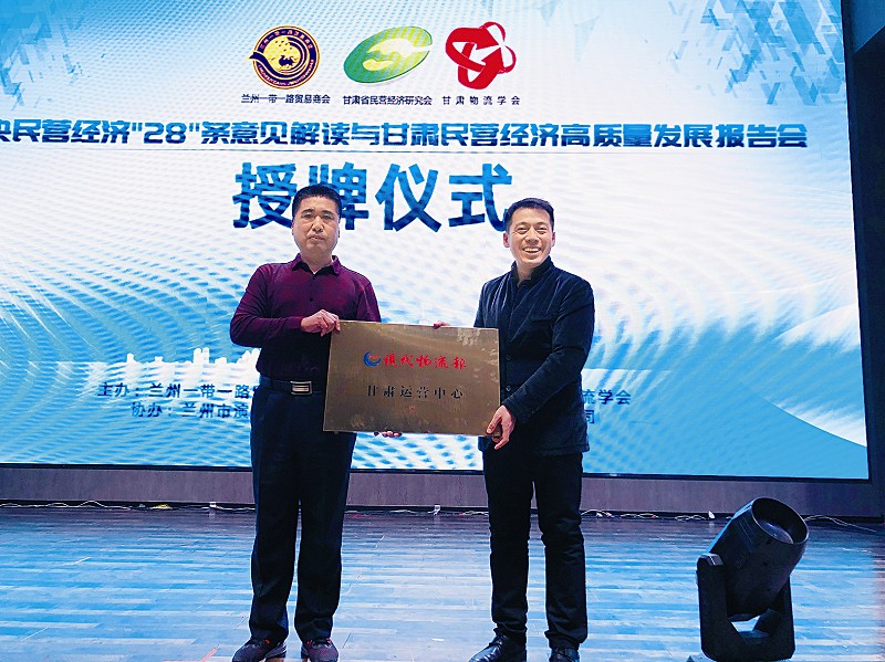 会议现场,《现代物流报》社社长李志东(左一)为“现代物流报甘肃运营中心”授牌。(董乐)