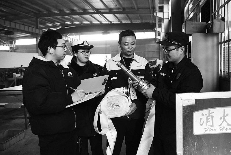 图为1月13日,马鞍山慈湖国家高新区安监局人员在安徽东洋刃模具公司检查消防设施完备情况。