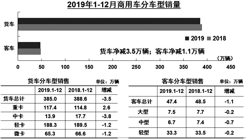 2019年1至12月,商用车产销436万辆和432.4万辆,产量同比增长1.9%,销量下降1.1%。在商用车主要品种中,与上年同期相比,客车产销呈小幅下降,货车产量略增,销量微降。