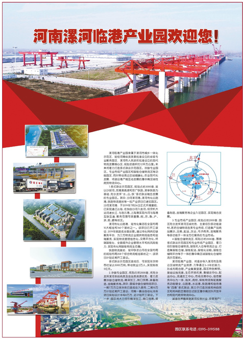 1.多式联运示范园区,规划占地3000亩,是以沙颍河、京港澳高速和京广铁路、漯阜铁路为基础,充分发挥“水、公、铁”多式联运融合发展的专业园区。其中,沙河漯河港、漯河传化公路港、铁路物流基地等一批产业项目已进驻园区。沙河漯河港,于2019年7月26日正式开港复航,已实现通江达海,往东由沙河入淮河、经京杭大运河进长江,与连云港、上海港实现内河与海港互联互通,服务范围可覆盖豫、皖、苏、鲁、沪、浙、鄂、赣等地区。