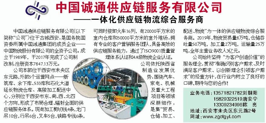 中国诚通供应链服务有限公司(以下简称“公司”)位于古城西安,是国务院国资委所属中国诚通集团的成员企业——中国物流股份有限公司的全资子公司。成立于1989年,于2017年完成了公司制改制,注册资本7847.13万元。
