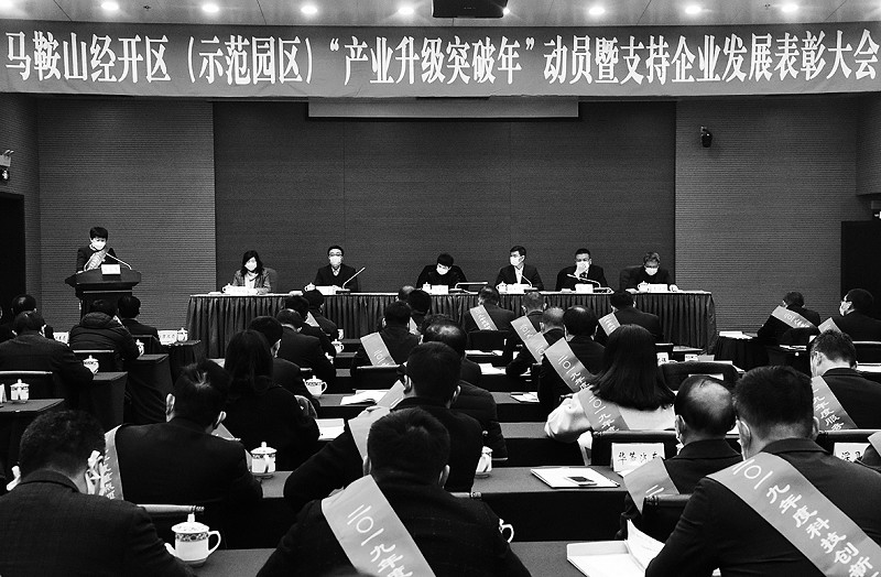 本报讯 (记者胡智慧摄影报道)3月13日,安徽省马鞍山经开区(示范园区)召开“产业升级突破年”动员暨支持企业发展表彰大会,总结上年重点项目建设、招商引资、“四送一服”、优化营商环境工作,动员部署开展“产业升级突破年”工作,隆重表彰“纳税突出贡献20强”“工业营业收入20强”“高质量发展20强”“外向型经济发展10强”“科技创新20强”“重点建设项目10强”企业管理团队、12家服务企业先进金融机构和7位招商引资突出贡献个人。