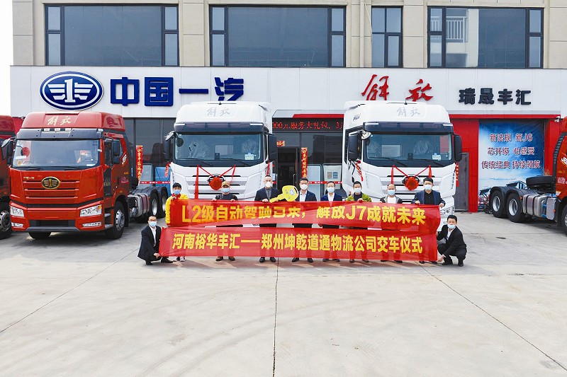 本报讯 (记者 代振锋 摄影报道)3月22日上午,一汽解放J7限量版在河南驻马店瑞晟丰汇汽车销售服务有限公司正式交付。一汽解放推出的全新智能版“解放J7”是“解放”卡车的最新版本,也是国产卡车的智能化扛鼎之作。 据了解,此次交付坤乾道通物流的两辆“解放J7”是河南市场首批投放车型。与传统的卡车相比,“解放J7”配置了专属定制发动机、超大油箱、轻量化设计,并实现了超长换油周期等优越性能,被业界誉为“宝藏车”。