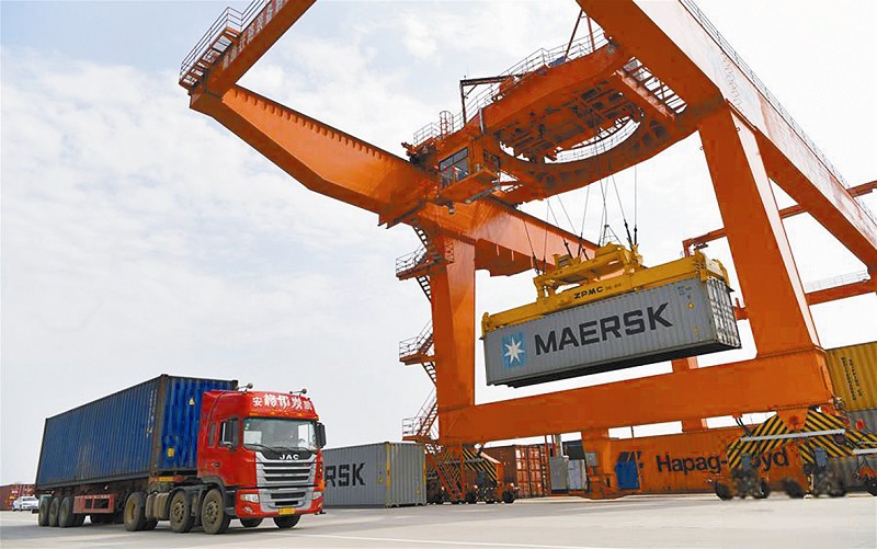 本报讯 疫情防控期间,江西省南昌县主动协调交通部门和物流企业,畅通物流通道,助力企业复工复产。图为4月6日,在江西省南昌县向塘铁路口岸,一辆货车装载集装箱后准备出发。 新华社记者彭昭之摄