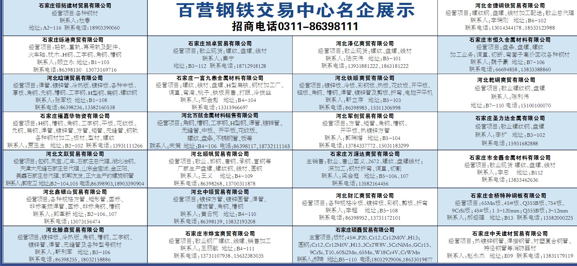 开平板、热镀锌方管联系人:郭瑞增 地址:B5-104 联系电话:13784337772、15031183299石家庄圣力达金属有限公司经营项目:敬业螺纹钢、盘螺联系人:李扩 地址:B3-102联系电话:15931682888河北文跃贸易有限公司经营项目:包钢、凤宝、汇丰、石家庄总代理、湖北冶钢、