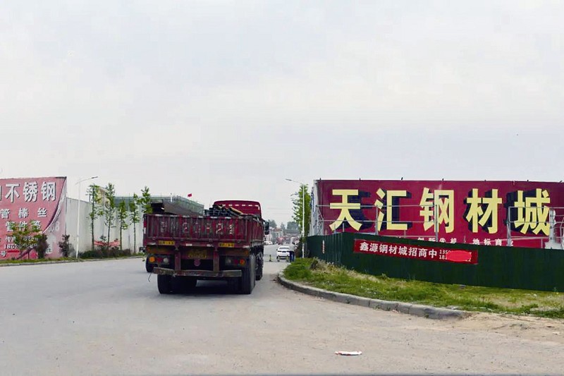 站在107国道上,远远的就能看到天汇钢材市场南侧一个巨幅的红色招牌,上面黄色的“天汇钢材城”格外醒目。大门北侧,某不锈钢公司的喷绘广告没有了以往亮丽的色彩,但上面的字仍旧清晰可辨。