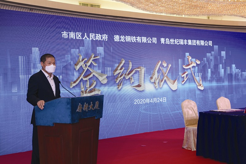 本报讯 4月23日,“德龙钢铁与青岛世纪瑞丰合资协议”、“德龙瑞丰和青岛市市南区人民政府的招商引资合作协议”签约仪式在青岛市府新大厦隆重举行。青岛市副市长耿涛、商务局局长张士玉,德龙集团董事长丁立国、总经理刘国旗,青岛世纪瑞丰董事长刘毓崑、副总经理毛显文等共同出席了此次签约仪式。