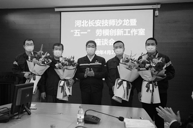 本报讯 (记者张奋勇摄影报道)“五一”前夕,河北长安汽车有限公司组织召开劳模座谈会,在热烈的气氛中,河北长安党委书记、总经理王金城,为公司员工,省劳模、省“五一”劳动奖章获得者顾帅圻、张赫、陈啊静、马江龙献上鲜花,代表企业对劳模的敬意。