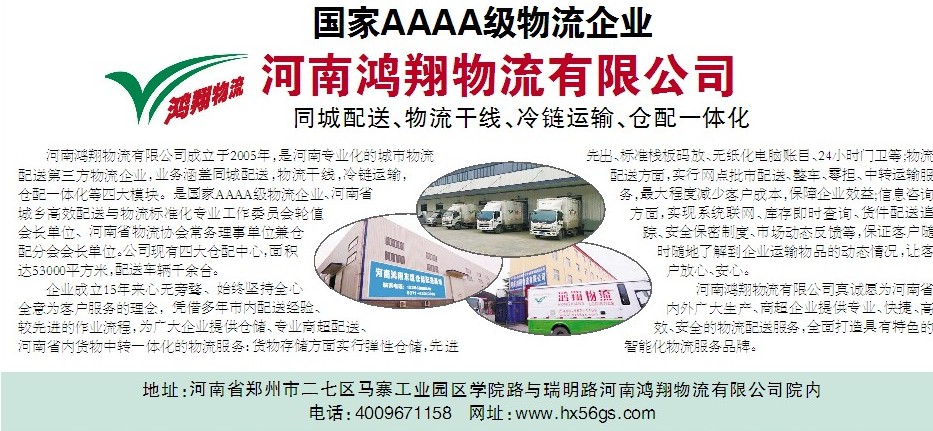 地址:河南省郑州市二七区马寨工业园区学院路与瑞明路河南鸿翔物流有限公司院内电话:4009671158 网址:www.hx56gs.com