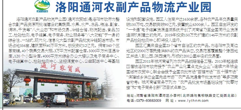 洛阳通河农副产品物流产业园(通河农贸城)是洛阳市政府为整合农副产品资源而批准建设的集蔬菜、水果、水产、冻品、粮油、副食、调味、干货等“八大业态”和市场交易、冷链仓储、物流配送、食品加工、检验检测、电子结算、电子商务、物业服务等“八大功能”于一身的综合性、一站式、现代化、信息化大型农副产品批发冷链配送市场。市场占地556亩,建筑面积40万平方米,总投资约12亿元。拥有560个三层商铺,40个蔬果交易大棚,3万平方米配套仓库,5000平方米恒温冷库,120个小型冷库,4000平方米综合办公大楼以及电子商务中心、电子结算中心、检验检测中心、监控调度中心、公益配送中心等基础设施和配套设施。园区入住商户达1650余家,各种农产品年交易量突破150万吨,交易额突破90亿元,安置就业6300余人。园区自主研发的“一卡通”电子结算货源追溯系统开创了河南省乃至全国同行业货源追溯机制建立的先河。2019年投资150万元扩建的146平方米的农副产品检验检测中心即将投入运行。