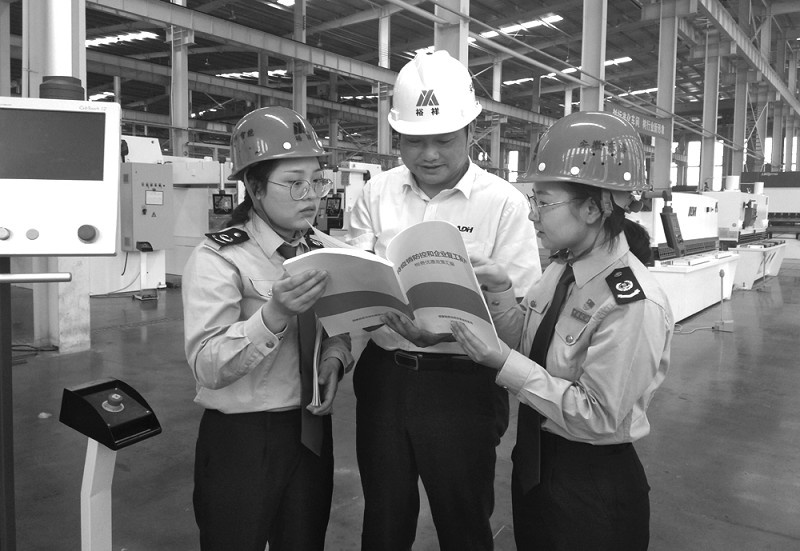 图为马鞍山市博望区税务局工作人员在东海机床公司宣讲疫情防控税收优惠政策。