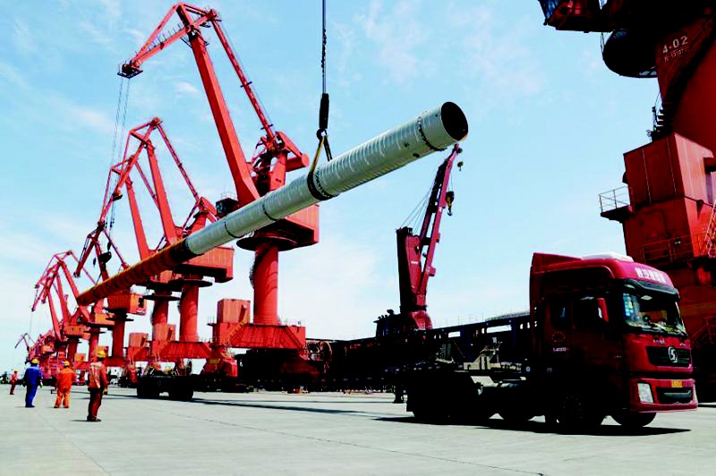 本报讯(通讯员宁勇 赵光辉摄影报道) 5月26日,随着一批长56.1米的超长钢管被安全吊装至“极速先锋”轮,辽港集团营口港一举刷新大件作业纪录,创下装船出口钢管长度之最。 据介绍,此次装船的超长钢管是中科北方装备制造有限公司复工后生产的首批产品,将用于加拿大LNG项目,最长达到56.1米,计划分两批次在营口港装船。此次装船的钢管为第二批,共139根,重6000余吨,其中5根56.1米超长钢管是迄今为止经营口港出口的最长尺寸钢管。