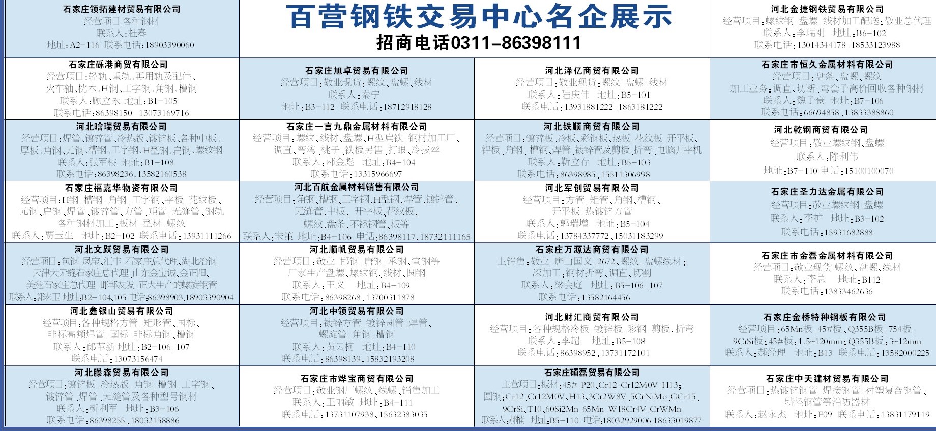 开平板、热镀锌方管联系人:郭瑞增 地址:B5-104 联系电话:13784337772、15031183299石家庄圣力达金属有限公司经营项目:敬业螺纹钢、盘螺联系人:李扩 地址:B3-102联系电话:15931682888河北文跃贸易有限公司经营项目:包钢、凤宝、汇丰、石家庄总代理、湖北冶钢、