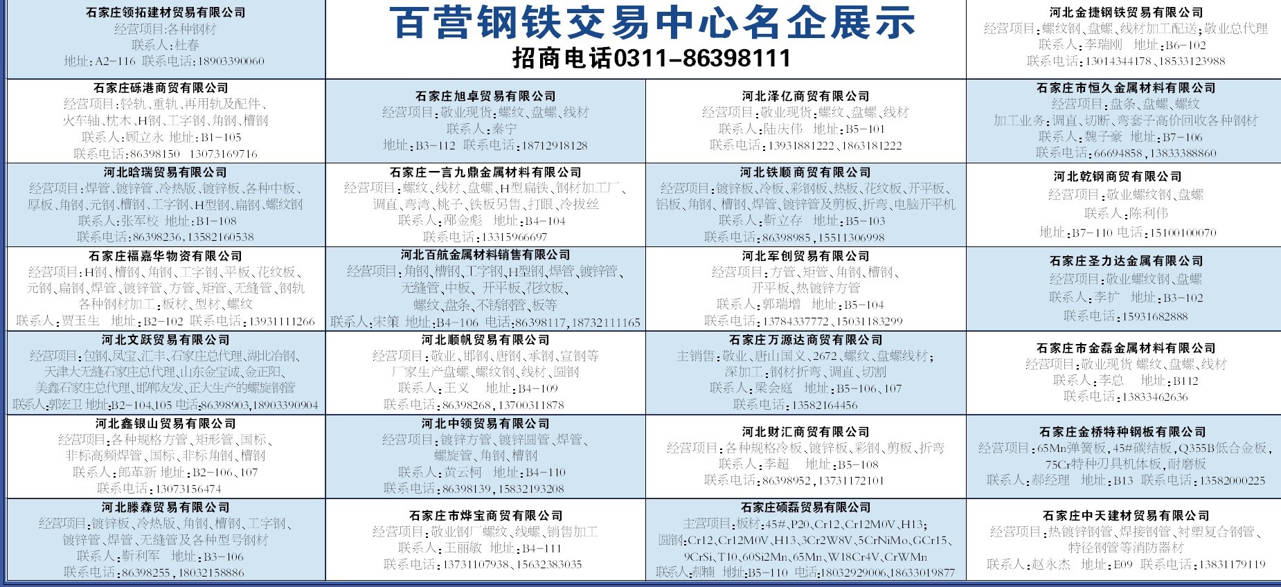 开平板、热镀锌方管联系人:郭瑞增 地址:B5-104 联系电话:13784337772、15031183299石家庄圣力达金属有限公司经营项目:敬业螺纹钢、盘螺联系人:李扩 地址:B3-102联系电话:15931682888河北文跃贸易有限公司经营项目:包钢、凤宝、汇丰、石家庄总代理、湖北冶钢、