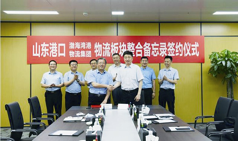 本报讯6月9日,山东港口渤海湾港与山东港口物流集团签署“物流板块整合备忘录”。山东港口渤海湾港党委书记、董事长、总经理张海军;山东港口物流集团党委书记、执行董事、总经理李武成;渤海湾港党委委员、副总经理,山东港口潍坊港党委书记、董事长曹方良等参加活动。