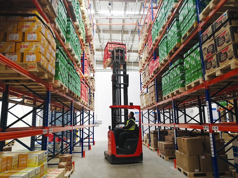 从月台接货,十几米就进入高架横梁仓库。一排排9米高货架整洁有序。仓内货品按ABCD……分类入仓。