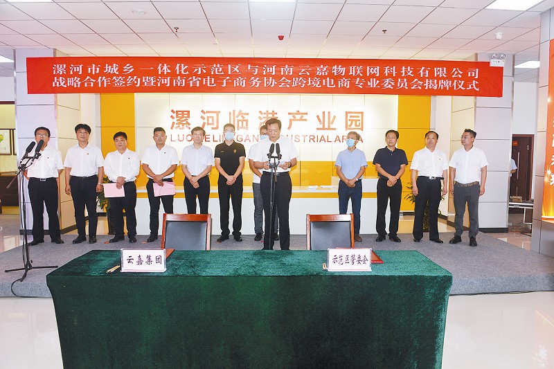 漯河市委常委、常务副市长高喜东,河南省商务厅、阿里巴巴(中国)教育、淘宝大学、河南云嘉物联网、顺丰集团、京东集团等单位代表参加。揭牌仪式上,示范区与河南云嘉物联网科技公司签订了战略合作协议。