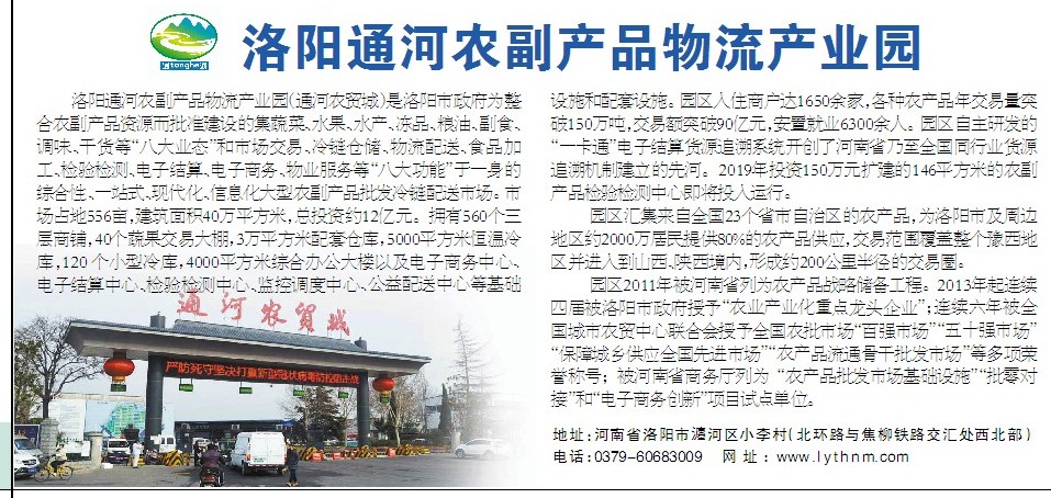 洛阳通河农副产品物流产业园(通河农贸城)是洛阳市政府为整合农副产品资源而批准建设的集蔬菜、水果、水产、冻品、粮油、副食、调味、干货等“八大业态”和市场交易、冷链仓储、物流配送、食品加工、检验检测、电子结算、电子商务、物业服务等“八大功能”于一身的综合性、一站式、现代化、信息化大型农副产品批发冷链配送市场。市场占地556亩,建筑面积40万平方米,总投资约12亿元。拥有560个三层商铺,40个蔬果交易大棚,3万平方米配套仓库,5000平方米恒温冷库,120个小型冷库,4000平方米综合办公大楼以及电子商务中心、电子结算中心、检验检测中心、监控调度中心、公益配送中心等基础设施和配套设施。园区入住商户达1650余家,各种农产品年交易量突破150万吨,交易额突破90亿元,安置就业6300余人。园区自主研发的“一卡通”电子结算货源追溯系统开创了河南省乃至全国同行业货源追溯机制建立的先河。2019年投资150万元扩建的146平方米的农副产品检验检测中心即将投入运行。