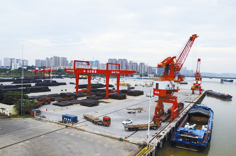 图为7月12日,长沙霞凝新港件杂货物码头,正在为一艘江苏籍从上海满载钢材、钢锭进港货轮抢卸。