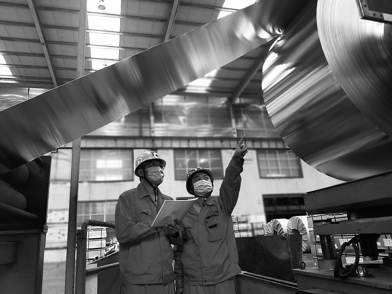 本报讯 (特约记者刘玉红通讯员王文宝摄影报道)河钢衡板瞄准食品级高端镀锡板领域,优化涂镀工艺,改进感应软熔系统,进一步提升产品档次,不断增强高端深加工产品的竞争力度。今年1~7月份,该公司高端奶粉罐底盖产品批量直供在青岛大客户,该批订单用于国内一线奶粉罐产品,累计签订订单960吨。 图为河钢衡板产线职工检查食品级马口铁的板面质量。