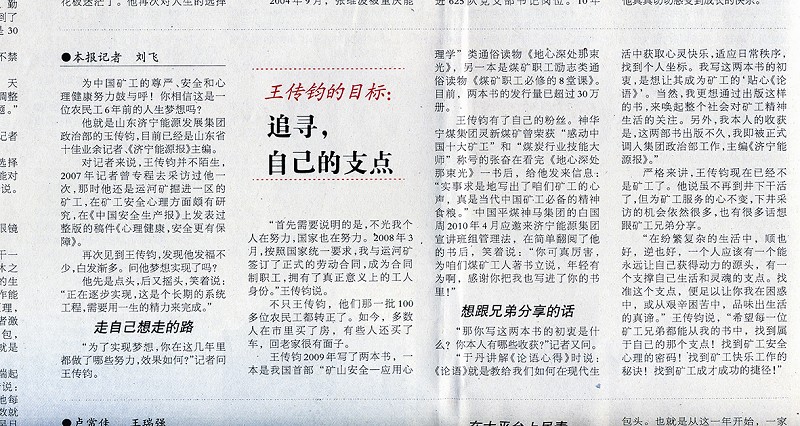 ——2013年7月,《中国煤炭报》在“中国梦矿工情”专栏以《王传钧的目标,追寻自己的支点》为题,