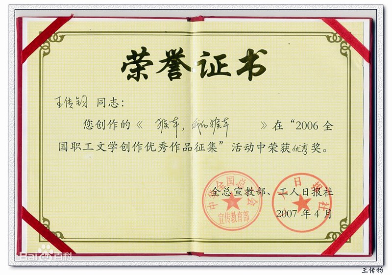 作为一名矿工,最初我的工作就是在保证安全的前提下,多出煤、出好煤,为国家煤炭事业做贡献。工作之余,我经常写点文章。2007年4月,我参加了由中华全国总工会和《工人日报》社联合主办的“2006年全国职工文学创作优秀作品”大赛,最终我写的赞美煤矿工人不畏艰辛、乐观向上的散文作品《猴车,我的猴车》获得了全国优秀奖。这也是我国文学作品中首次涉猎井下“猴车”的作品(借物喻人),而且整个山东省只有5人获奖,我是其中之一。