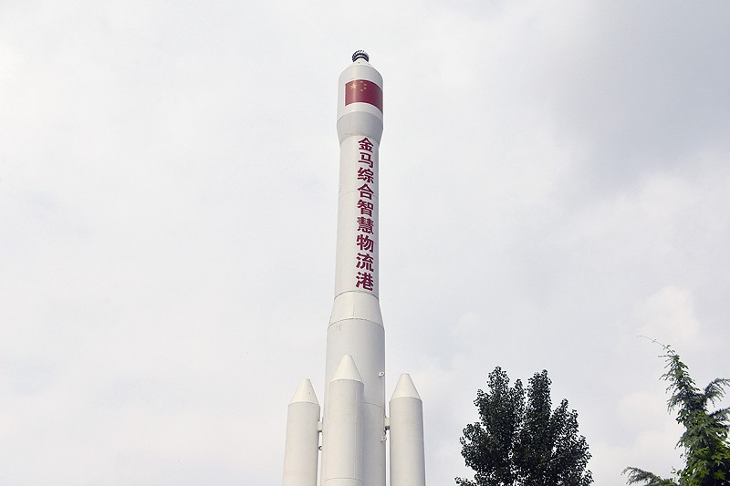 与前些日子不同的是,紧邻S321省道南侧建设了绿色基调为主题的招商处,远远的就可以看见一个巨型的白色“火箭”装置,顶端部位的国旗在阳光下十分醒目,“金马综合智慧物流港”搭载在耸立的箭体上,带着几分“霸气”。