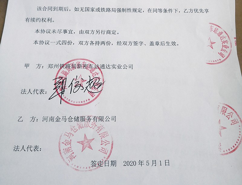 为了满足大批量钢材和部分建筑钢材进入园区,提高周转效率,今年“五一”期间,园区与郑州市铁路局签订了铁路站台合作协议,正式开启了金马市场的“公铁联运”时代。他向记者展示了有关铁路站台的合作协议。
