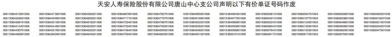 天安人寿保险股份有限公司唐山中心支公司声明以下有价单证号码作废
