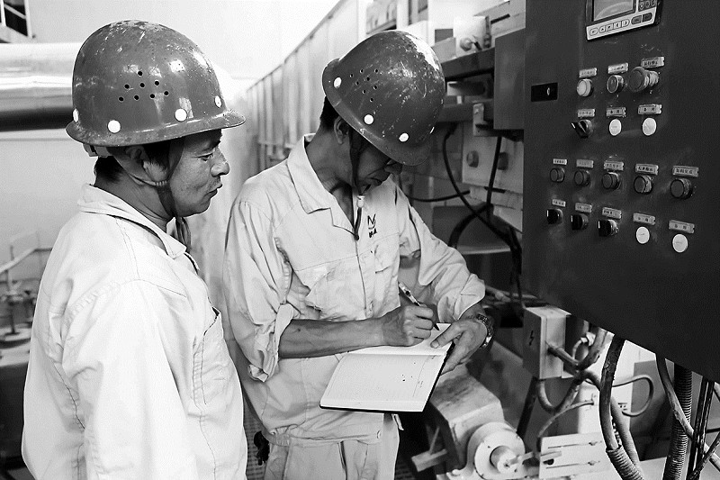 本报讯 (通讯员陈源贵摄影报道)近日,铜陵市进入“炙烤模式”。在这样的时节,铜化集团公司许多基层劳动者因工作需要,扎根一线,坚守岗位,挥汗如雨,埋头苦干,用汗水和奉献书写劳动人生。 图为铜化集团安纳达钛业公司两名员工正在检查记录装置运行情况。