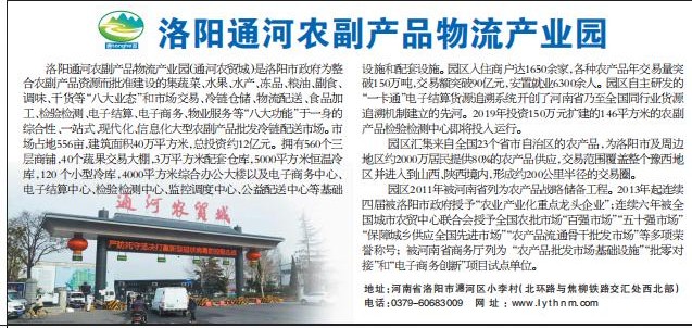 洛阳通河农副产品物流产业园(通河农贸城)是洛阳市政府为整合农副产品资源而批准建设的集蔬菜、水果、水产、冻品、粮油、副食、调味、干货等“八大业态”和市场交易、冷链仓储、物流配送、食品加工、检验检测、电子结算、电子商务、物业服务等“八大功能”于一身的综合性、一站式、现代化、信息化大型农副产品批发冷链配送市场。市场占地556亩,建筑面积40万平方米,总投资约12亿元。拥有560个三层商铺,40个蔬果交易大棚,3万平方米配套仓库,5000平方米恒温冷库,120个小型冷库,4000平方米综合办公大楼以及电子商务中心、电子结算中心、检验检测中心、监控调度中心、公益配送中心等基础设施和配套设施。园区入住商户达1650余家,各种农产品年交易量突破150万吨,交易额突破90亿元,安置就业6300余人。园区自主研发的“一卡通”电子结算货源追溯系统开创了河南省乃至全国同行业货源追溯机制建立的先河。2019年投资150万元扩建的146平方米的农副产品检验检测中心即将投入运行。