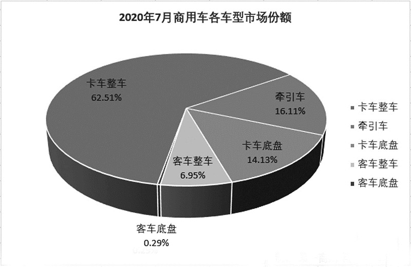 7月份,商用车44.71万辆的销量在整个汽车市场上占到了21.17%的份额,商用车市场在整个汽车市场的份额呈逐月缩窄态势(3月份额为27.10%,4月份额为25.79%,5月份额为23.70%,6月份额为23.31%)。尽管如此,7月份商用车占汽车市场21.17%的份额也算不上常规表现,因为在常规年份,商用车份额超过20%是比较罕见的。2020年2~7月份,商用车市场已连续四个月份额超过20%,2、3月甚至超过27%。4月份,汽车市场实现转正,但乘用车市场产、销量仍是小幅下降之态,而商用车市场已先于乘用车市场实现转正;5月份开始,乘用车市场终于实现增长,但商用车市场的表现要明显好于乘用车。从这个角度,不难看出在疫情影响之下,商用车市场的“抗疫”表现要优于乘用车市场,疫后复苏也是先于乘用车市场,但商用车在汽车市场中份额逐月缩窄的态势,也可以反映出整个汽车市场是逐步往“常规”的轨道上走的。