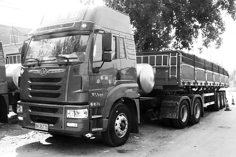 不是以汽油、柴油为燃料,而是以液化天然气(LNG)为燃料的新能源汽车。济矿物流力推的车型是青岛解放天V(LNG)430马力+13米×2.5米×0.6米侧翻自卸车。