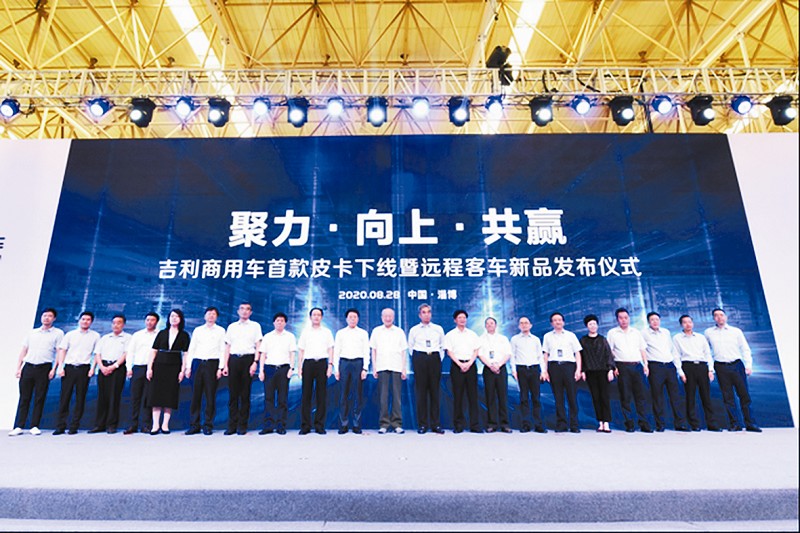 本报讯8月28日,以“聚力·向上·共赢”为主题的吉利商用车全新产品下线仪式在山东淄博基地正式拉开帷幕,活动现场两款重磅车型——首款皮卡以及新款客车首发亮相,充分诠释了吉利商用车在向上道路上的全新实力。
