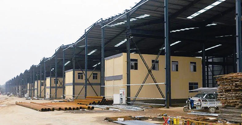 市场北部,是一排即将交付使用的大型钢结构室内仓储库房,每个库房内都建设有两层办公生活小楼。