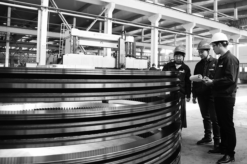 本报讯(记者胡智慧通讯员张观良摄影报道)2020年11月12日,落户在安徽省马鞍山市经开区的方圆精密公司的职工在加工大型回转支承,源源不断发往生产风电设备的企业。