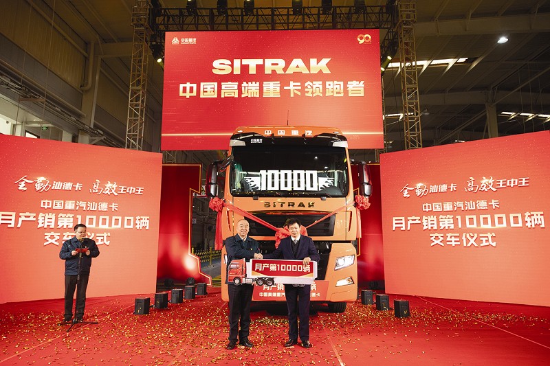 本报讯(记者 任宏) 11月30日上午,汕德卡月产销1万辆暨交车仪式隆重举行。随着“下线”的一声号令,2020年11月第1万辆汕德卡披红挂彩驶下生产线,这是继今年3月汕德卡月产销突破5000辆后,创造的又一月产新纪录!作为中国重卡迈向高端的引领者,中国重汽汕德卡自2013年上市以来,成为国内上市最早、销量最大的高端重卡品牌。从2015年国内销量不足1000辆,到年销售突破10000辆,再到2019年一季度订单实现3000辆。2020年3月,汕德卡月产销突破5000辆,时隔8个月后的今天,汕德卡再次迎来高光时刻,月产销突破1万辆,1~11月份累计订单同比增长259%。