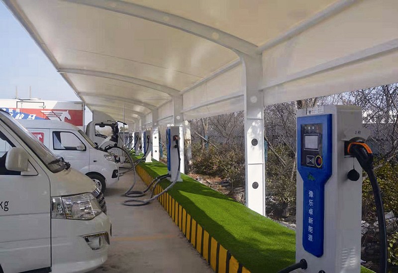 在充电桩的上方装饰着洁白的遮阳板。站在遮阳板的下面抬头仰望,洁白无瑕的遮阳板在蓝天的映衬下,好像是一片扬起的风帆,正在苍茫的大海中劈风斩浪、昂首前进。充电桩前,十几台新能源物流汽车正在有序地充电。