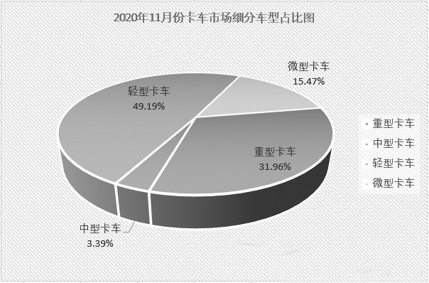 中卡在卡车市场份额非常小。2020年11月,中卡市场24%的同比增幅优于卡车市场整体21%的增幅。1~11月12%的累计增幅则是跑输卡车市场的整体表现。