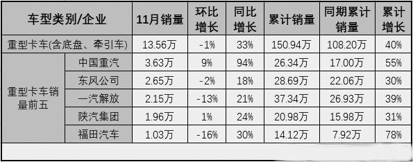 11月份,重卡市场增长33%;经过连续8个月的大增,今年重卡市场的累计销量增幅也扩大至40%。重卡市场11月份增幅是跑赢卡车市场整体的21%,1~11月累计增幅也是明显优于卡车市场的整体表现。