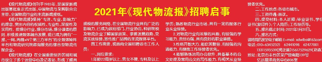 1.年龄22周岁以上,男女不限,专科及以上学历;熟悉物流行业市场,具有一定的媒体行业从业经验。