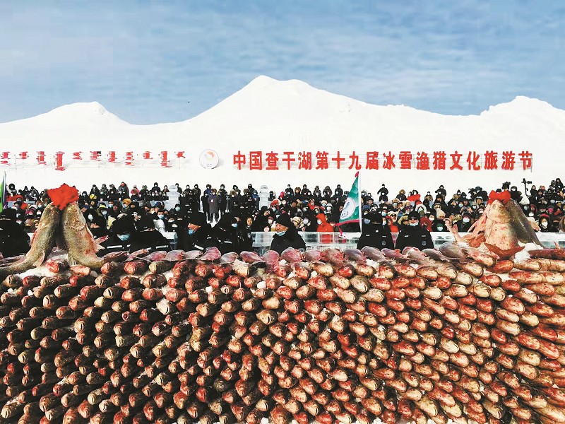 本报讯(记者孙昌辉摄影报道)一条头鱼拍价近300万元,中国查干湖第十九届冰雪渔猎文化旅游节开幕式当日,经过几轮竞拍后,吉林省浙江商会最后一槌定音拍出2999999元。这是历届冬捕渔猎拍出的最高天价。开幕式当日,京东快递、邮政快递也出现在广场东侧,来自全国各地的一支支网络大V现场直播带货,查干湖第十九届冰雪渔猎文化旅游节插上了现代物流快递的翅膀。